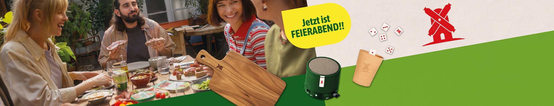 Es gibt insgesamt drei limitierte und exklusive Rügenwalder Mühle Feierabend Prämien. Wir haben für jeden Feierabend Typ etwas dabei: Wähle pro Teilnahme zwischen einem Feierabend Mini Bluetooth-Lautsprecher, einem Feierabend Brett aus Akazienholz und einem Mühlen Würfelspiel aus.