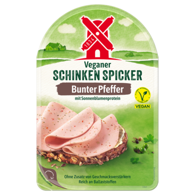 Wir stellen den Veganen Schinken Spicker von der Rügenwalder Mühle auf der Basis von Sonnenblumenkernen her. Angereichert wird er mit einer kleinen Menge an Rapsöl mit Omega-3-Fettsäuren.